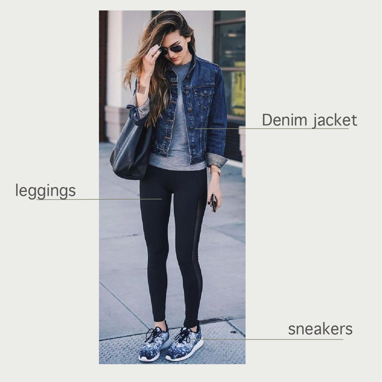 緊身褲與球鞋的搭配不一定只能去上體育課!加上一件男孩風的牛仔外套與墨鏡,讓休閒舒適的穿搭瞬間變得帥氣十足。