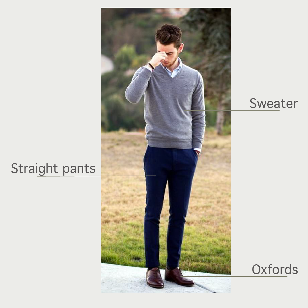 想要呈現英倫雅痞的氣息,牛津鞋是不可或缺的經典單品。另外,可以在襯衫外套件V領針織毛衣或背心,增添學院風格。