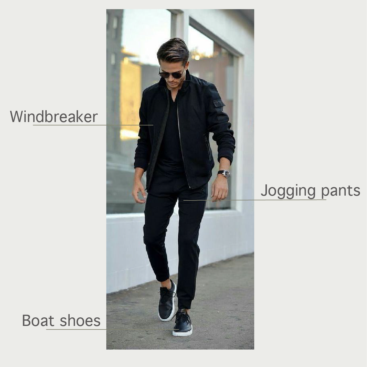 全身黑是最容易、又能呈現酷帥風範的搭配了。一件黑素T、黑褲,再加上稍有份量的外套以及墨鏡和油頭,輕鬆用基本單品打造俐落有型的風格。