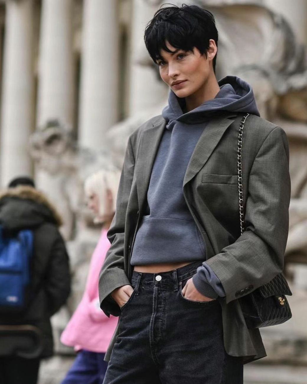 為了避免連帽外套的帽子看起來過於鬆垮,可以採用捏帽法來增加其立體感和支撐力。在帽子的後半部分進行適度捏合,形成一個更加結實和立體的形狀,這樣帽子既不會輕易滑落,也更具時尚感。