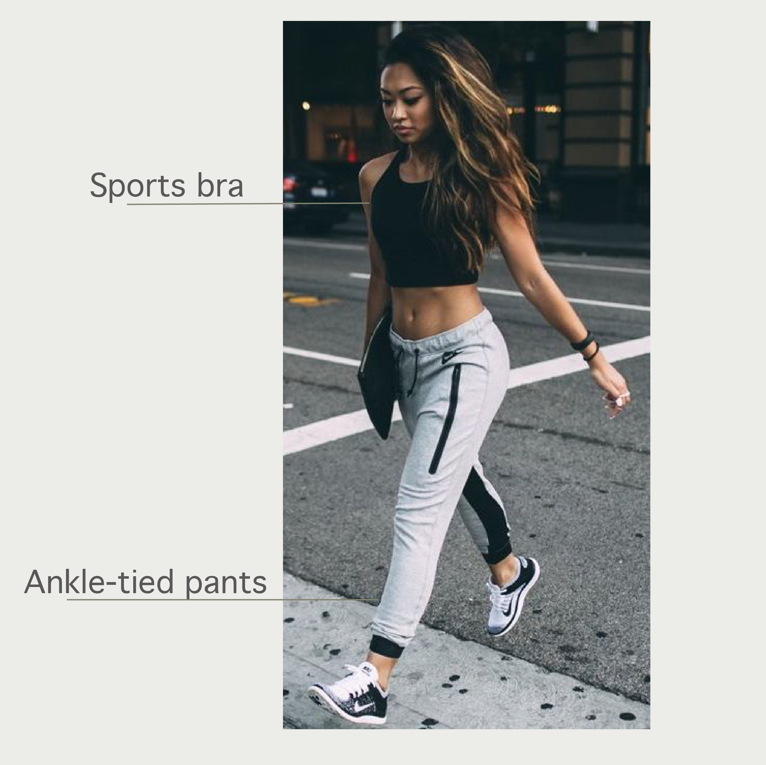 如果妳練就了一身結實腹肌,不如就在運動時大膽展現吧!短版運動內衣配上束腳褲,在性感之外,也能多一點混搭時尚感。
