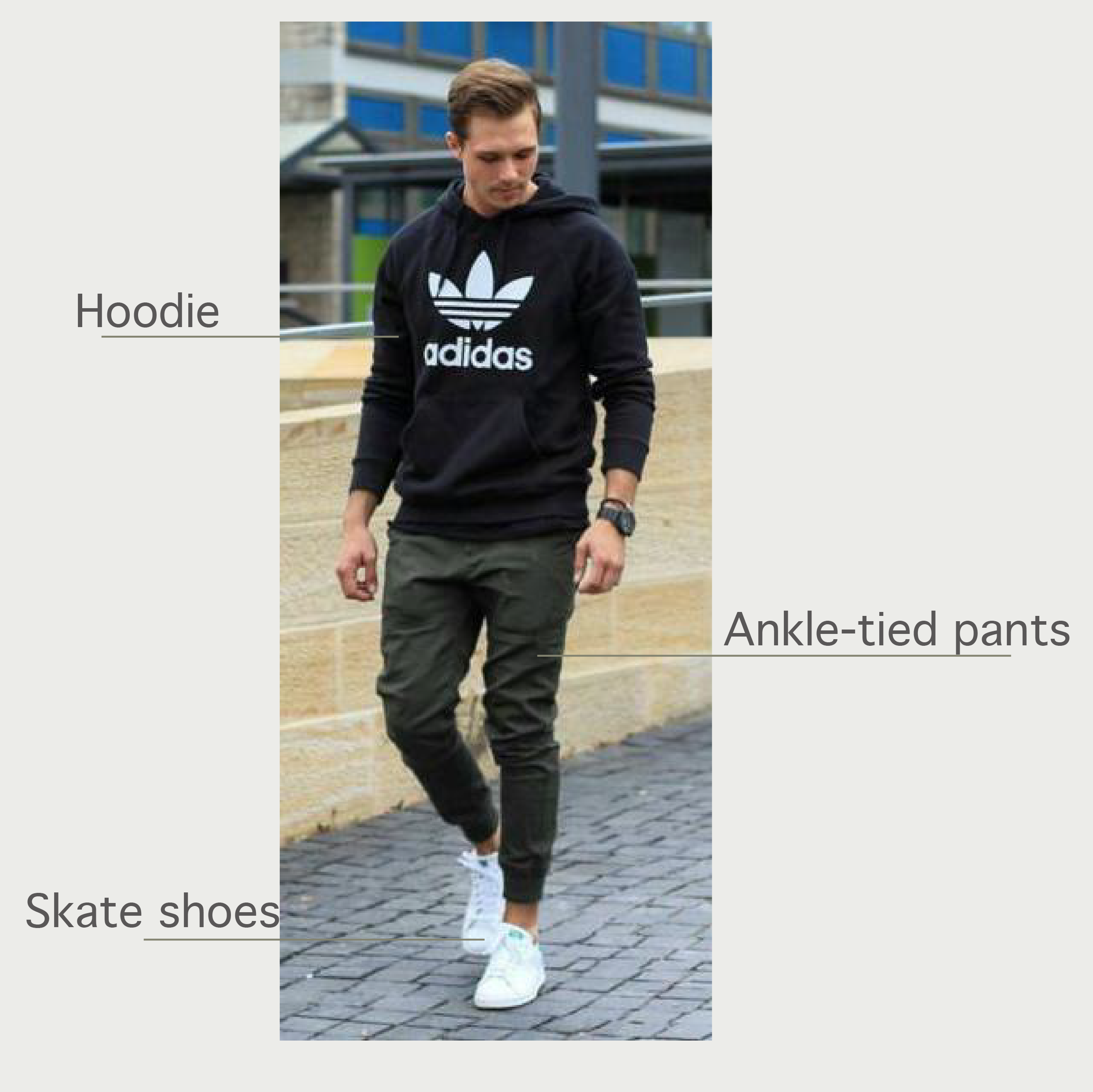 時下最流行的運動風穿搭莫過於黑色帽T配上白鞋了。配上縮腳褲露出一節腳踝,再加上墨鏡就可以更帥氣。