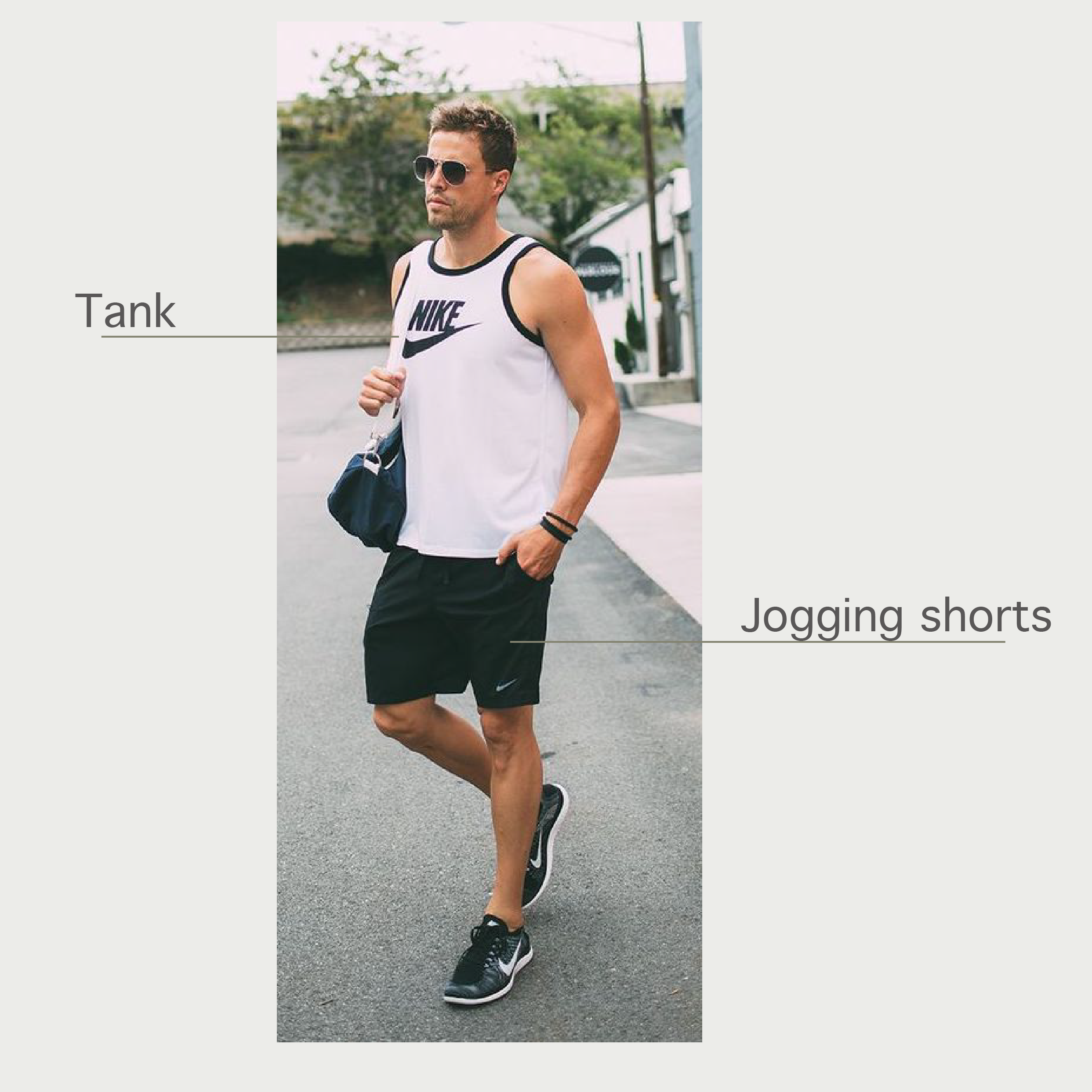 炎熱的夏天什麼都穿不住吧!寬鬆的運動背心加上慢跑短褲絕對是最好的選擇。這樣的穿搭既涼爽,也適合各種運動。