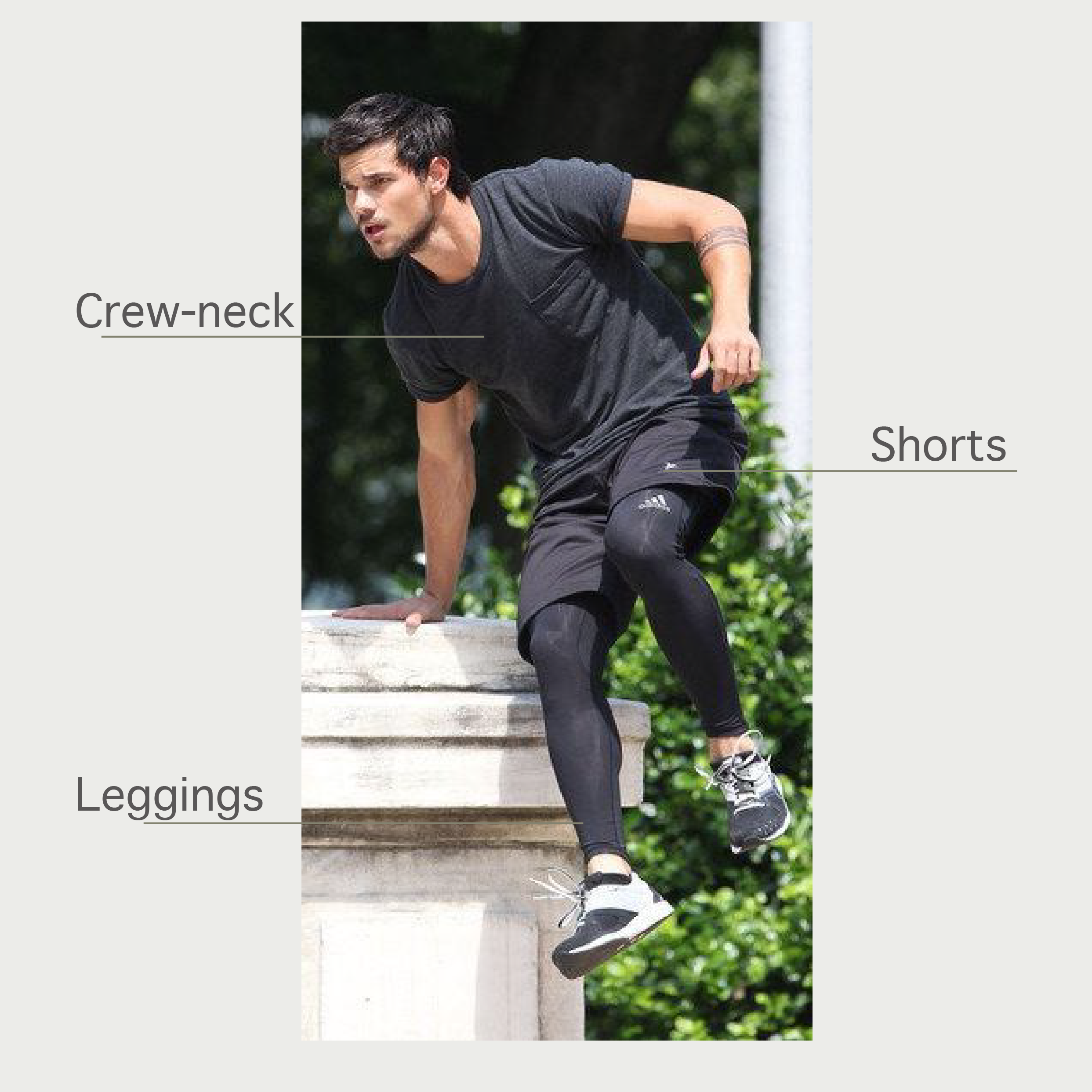 排汗材質的素T加上短褲及運動緊身褲,活動自如。時尚的關鍵在於全身黑的搭配。